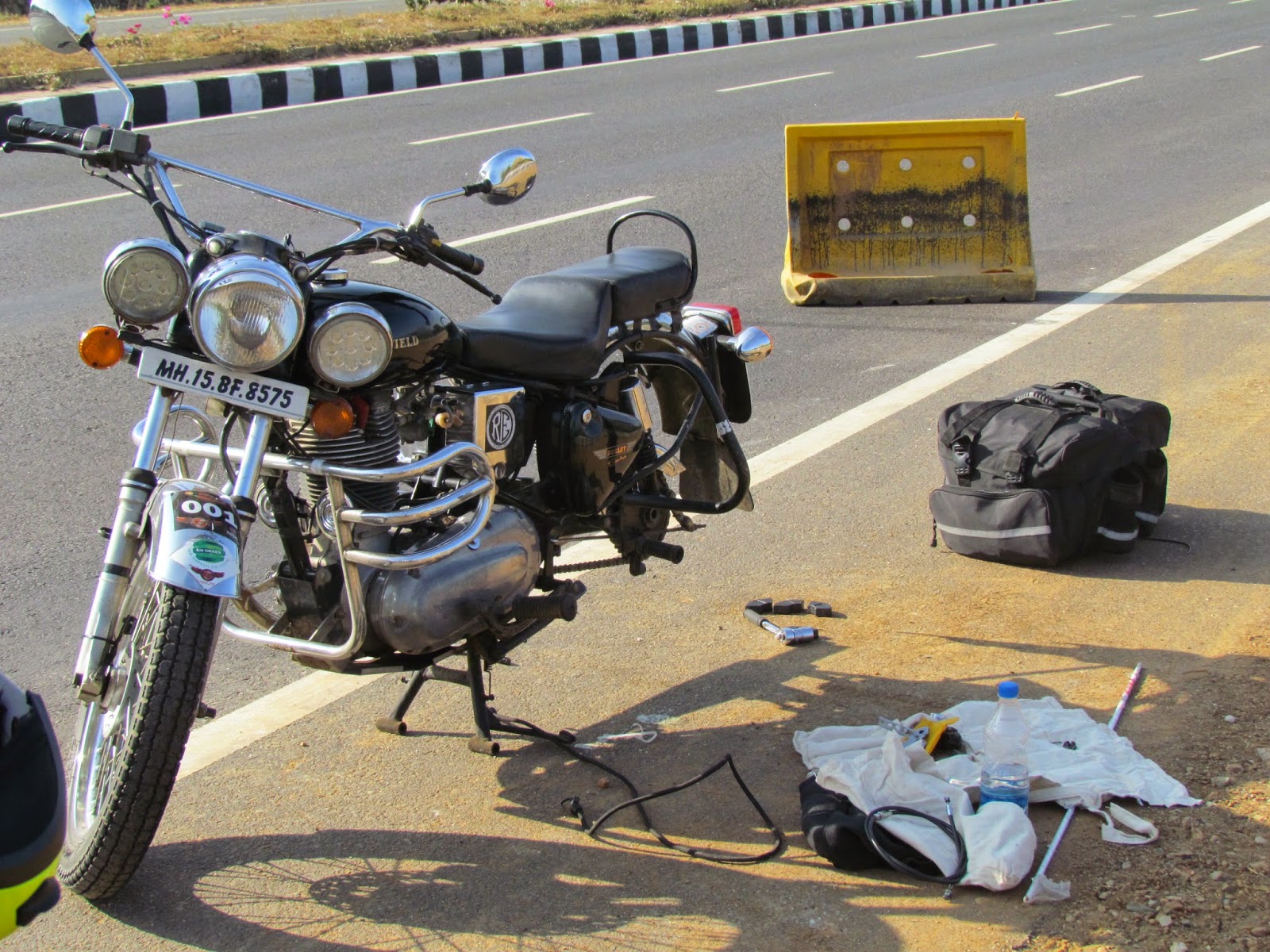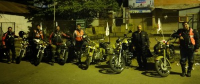 To make matters worse, the delay because of the punctures meant that we had to break our rule, and that is not to ride after dark. To be fair, the time was about 07:30 p.m. and it was just turning from dusk to night. Loki, one of our experienced riders couldn’t see a large stone left in the middle of the highway, probably by some truck driver whose truck had broken down earlier. Loki hit the stone, flew a little in the air and landed hard. The front tyre rim was bent and he could not proceed further, even to Tumkur, which was jus 30 kms. away.
