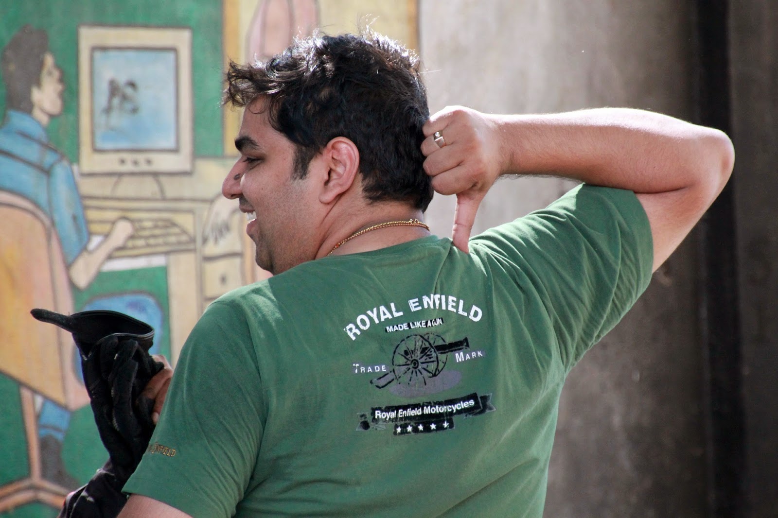 Day 3 started with another lesson. We decided to change Loki’s front tyre rim as this was a quicker solution to repairing the rim. But the RE showroom in the town was closed due to the festival of Pongal. We finally tracked down a mechanic and brought him from his house to his workshop to repair the rim. The repair took 4 solid hours and gave time for some more photo ops.